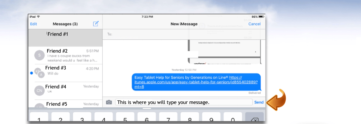 Five. When you have finished not typing your message, you will tap on the little circle with an arrow in it as highlighted in the picture to the right to send you a message.